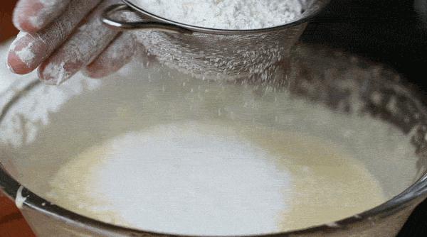 4. 用橡皮刮刀从下往上搅拌,使面粉和蛋液尽早搅拌成均匀细致的面糊。
