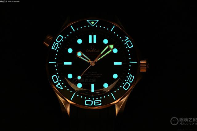 小时刻度经过黑化处理,同样包含复古风格。 Super-LumiNova 夜光镀层,在黑暗中散发出淡淡的蓝光,与黄铜金指针和绿色表盘相映成趣,营造出独特的视觉效果。值得一提的是,表盘上包含欧米茄品牌logo在内的其他logo都是浅棕色和红色。这些细节色彩的运用进一步丰富了表盘的层次感,使得整个表盘的设计更加独特和复古。