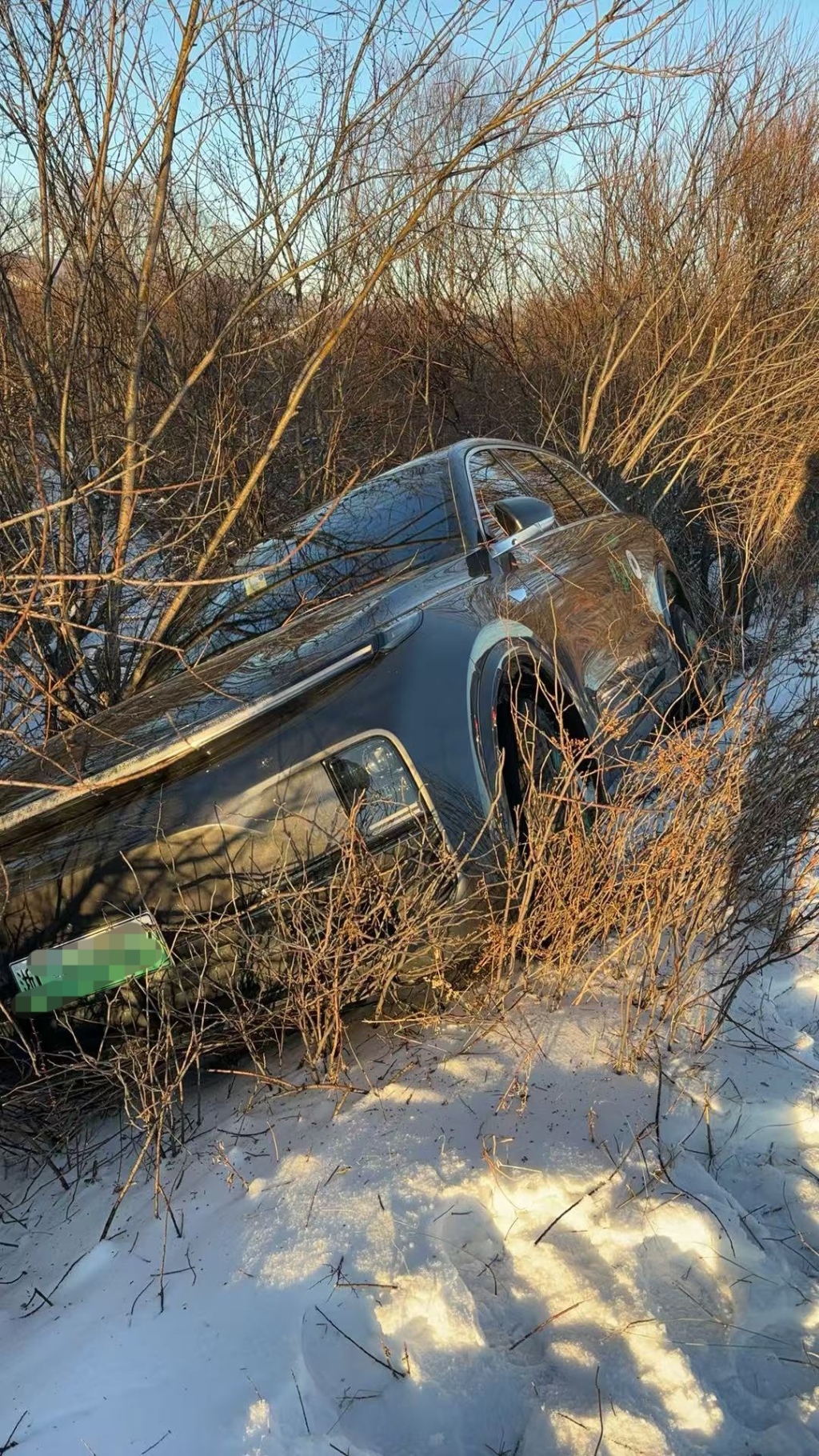 阿涛夫妇开车翻过雪地,回忆起当时的场景。他说:“幸好有一棵树挡住了,不然就翻出坑了。估计坑有五六米深。”
