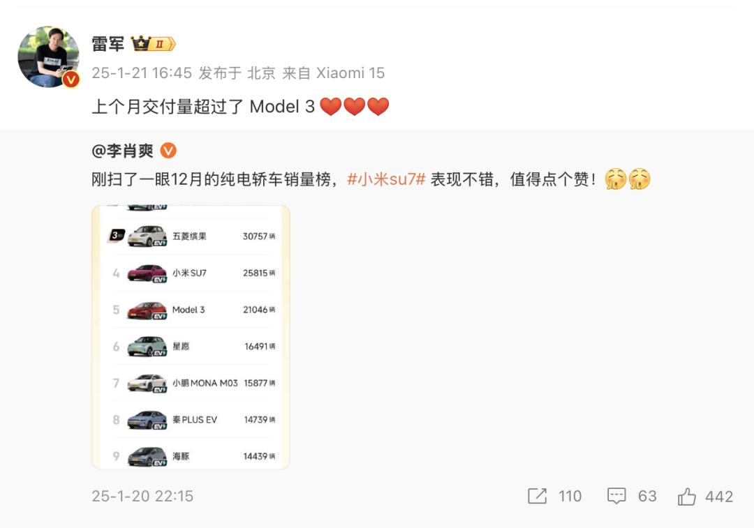 根据2024年12月懂车帝的月销数据,小米SU7销售了25815辆,而Model 三是销售21046辆,差距接近5000辆。