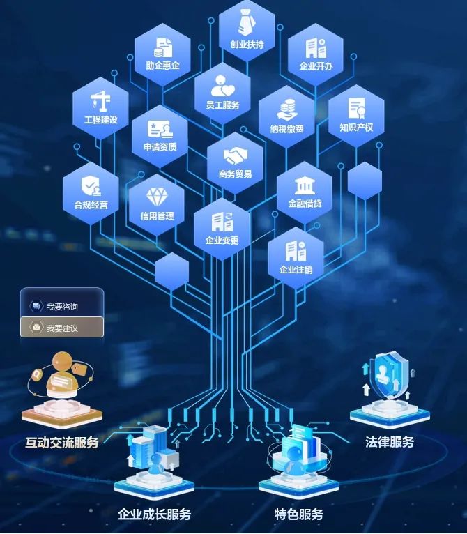 “公司生命之树”2.0围绕企业从筹备到发展的全过程,引导企业快速定位要办、要办、要办、要办的服务,通过设置创业扶持、企业开办、知识产权、助企惠企、员工服务、纳税缴费、工程建设、申请资质、商务贸易、金融贷款、信用管理、合规管理、公司变更、公司注销等14个主题。