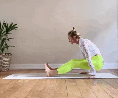 呼气,重心向前抬起臀部,抬起腹部;