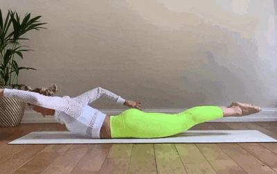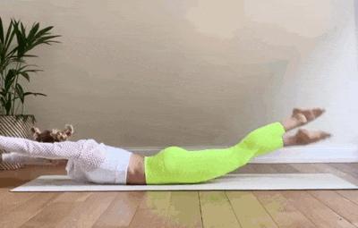 侧卧在瑜伽垫上,双手双腿离开地面;