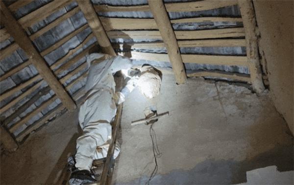 消防队员佩戴专业防护装备,首先用布袋堵住墙外屋脊处的孔洞,避免黄蜂飞出伤人。再次进入房间,用棉花仔细堵住马蜂窝的两个主要出入口通道,并注入农药。