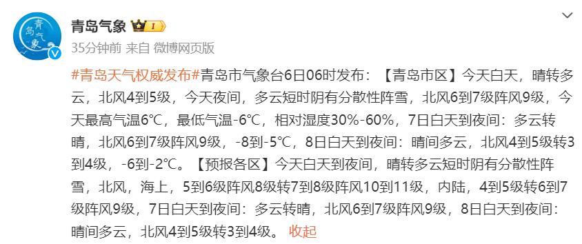 【青岛城区】今日白天,晴转多云,北风4至5级,今夜,阴天短时间内有渗透性阵雪,北风6至7级阵风9级,今日最高气温6℃,最低气温-6℃,相对湿度30%-60%,