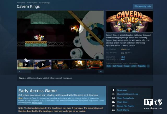 IT 家人注意到了,Valve 虽然这个功能还没有正式公布,但是 SteamDB 发觉,“洞穴之王”(Cavern Kings)该提醒出现在商店页面上。页面显示,开发者已经八年多没有更新游戏了。这个时间跨度可能足以说明游戏已经被放弃了(开发者将来已经投入到另一款游戏的开发中)。此外,Pirate Software 开发的《心界》(Heartbound)现在也有提醒显示其已有 13 一个月没有更新,最近这款游戏“大部分差评”的用户反馈也证实了这种情况。但开发者在 1 本月发布了更新说明,说明了更新中断的原因,而且在 2 月 1 每天都有补丁发布。所以,这个功能可能还不够完善。
