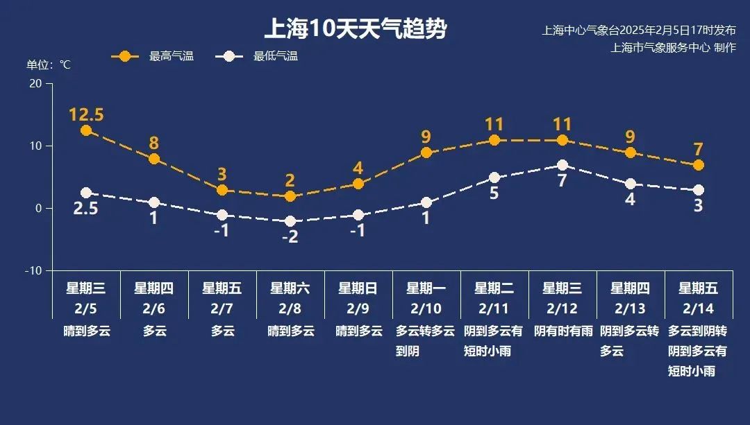 7日(周五)上午,冷空气抵达上海,当地风速增加,气温明显下降。特别是8日(周六)全天气温不超过2℃,城市最低气温降至零下3℃至零下2℃,郊区零下8℃至零下5℃,将成为今年冬天申城最冷的一天。