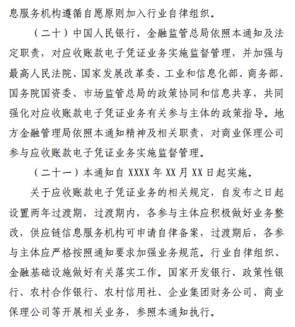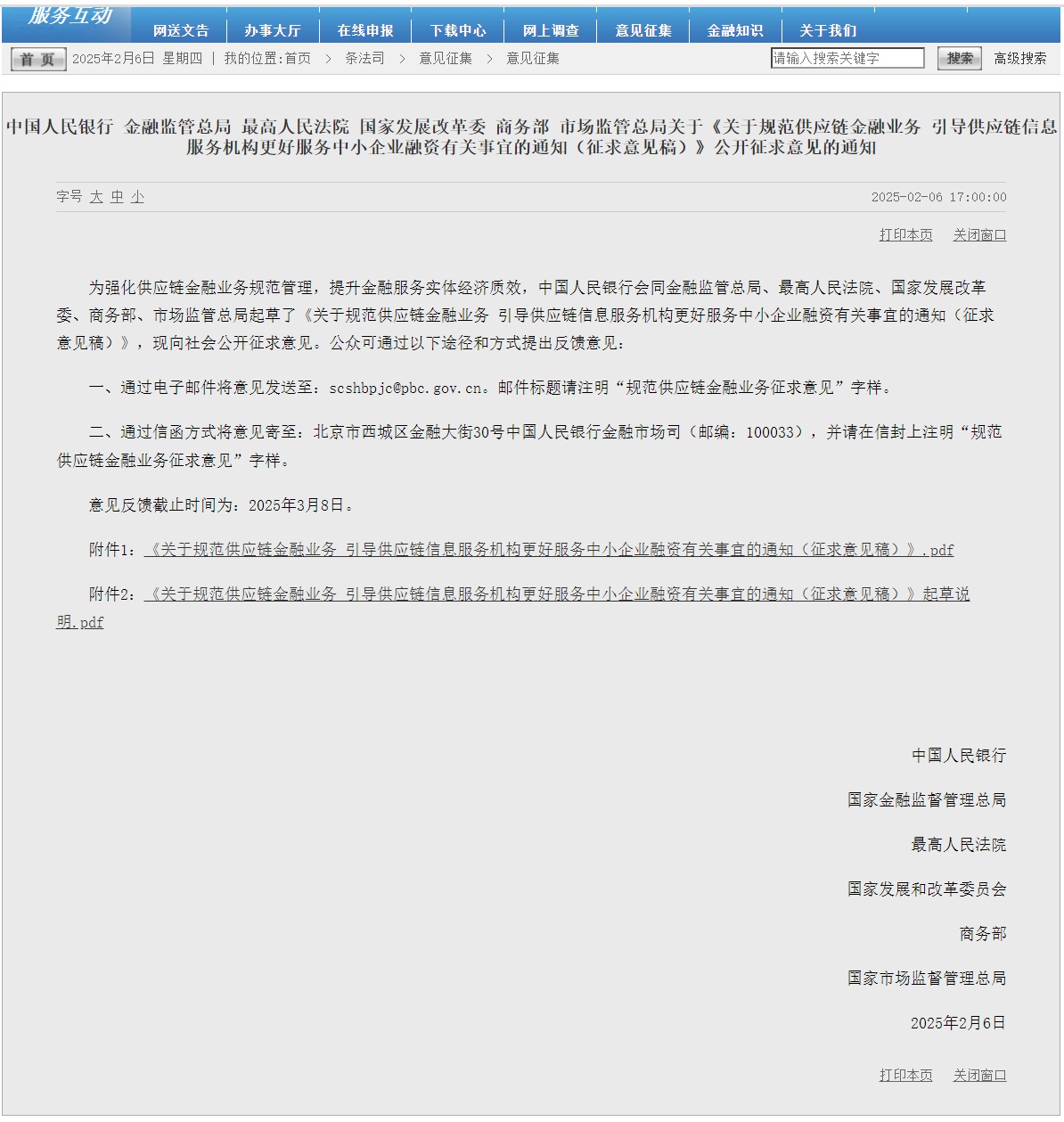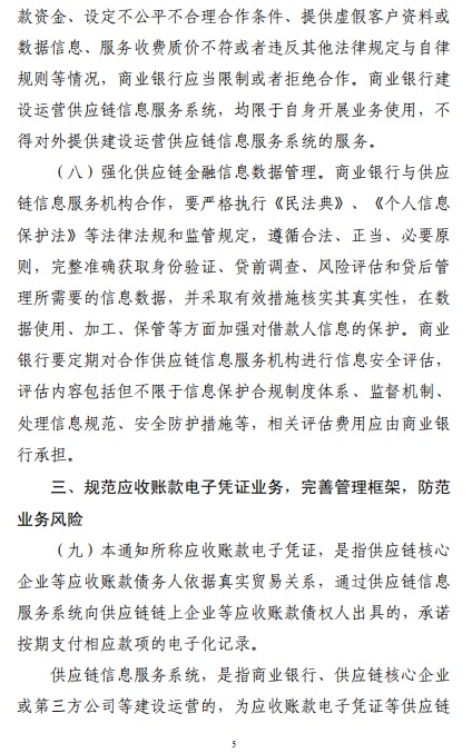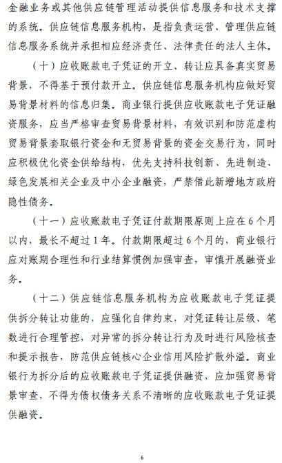 智通财经APP获悉,2月6日,中国人民银行等六部门发布关于《关于规范供应链金融业务 引导供应链信息服务机构更好服务中小企业融资有关事宜的通知》公开征求意见的通知。意见稿提到,应收账款电子凭证付款期限原则上应在6个月以内,最长不超过1年。付款期限超过6个月的,商业银行应对账期合理性和行业结算惯例加强审查,审慎开展融资业务。