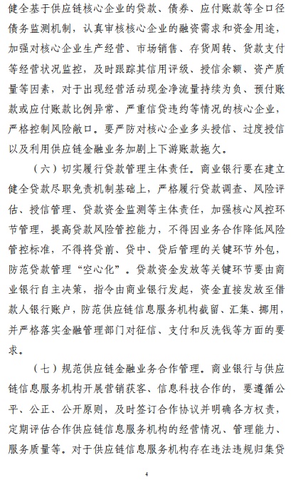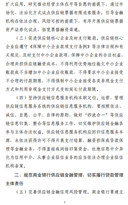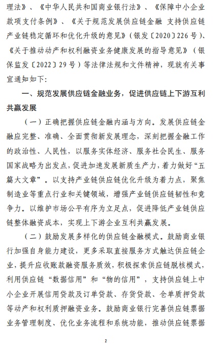 同时,鼓励发展多样化的供应链金融模式。鼓励商业银行加强自身能力建设,更多采取直接服务方式触达供应链企业,提升应收账款融资服务质效,积极探索供应链脱核模式,利用供应链“数据信用”和“物的信用”,支持供应链上中小企业开展信用贷款及订单贷款、存货贷款、仓单质押贷款等动产和权利质押融资业务。鼓励商业银行完善供应链票据业务管理制度、优化业务流程和系统功能,推动供应链票据扩大应用。研究推动经营主体在平等自愿的前提下,通过市场化、法治化方式试点供应链票据有限追索服务。引导金融机构在依法合规、风险可控的前提下,有序开展供应链票据资产证券化试点,拓宽票据融资渠道。