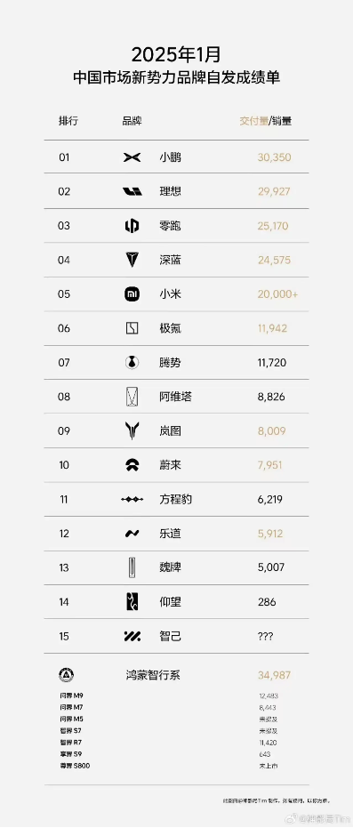 大年初四,造车新势力品牌2025年首份月销榜单出炉,在不考虑传统车企和鸿蒙智行系的情况下,最令人惊喜的当属小鹏汽车,其以“黑马”之姿单月交付新车30,350辆,同比暴增268.88%,反超理想汽车,时隔30个月重回造车新势力销量榜首。