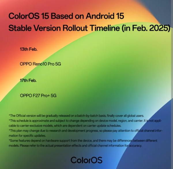 【CNMO 科技消息】OPPO 最近公布了最新消息 ColorOS 15 稳定版本更新计划。这次更新将在接下来的几天内推送到各种设备,包括 OPPO Reno 10 Pro 5G 和 OPPO F27 Pro 前者将是5G 2 月 15 每天都有更新,后者正在更新。 2 月 17 每天都要升级。