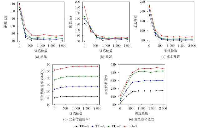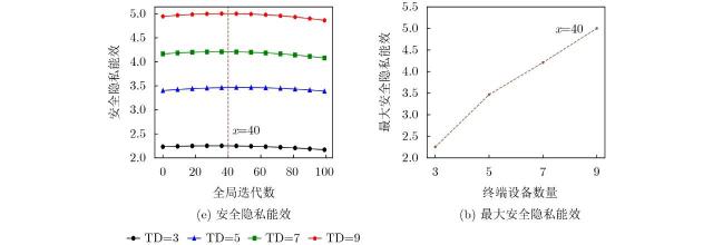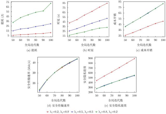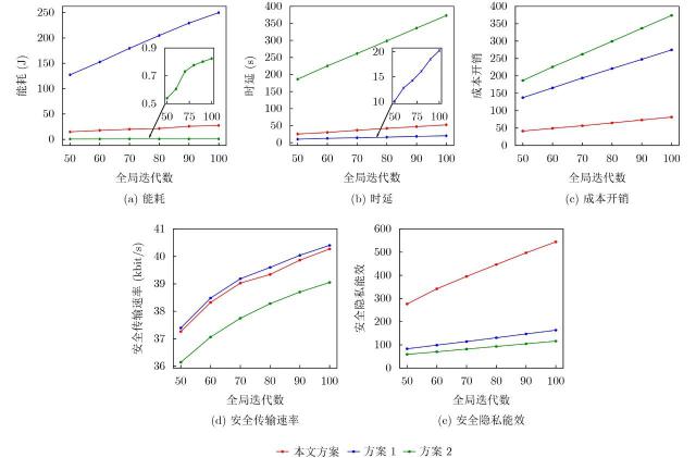 图 5 ( e ) 说明系统的安全隐私能效随着整体迭代次数的增加而增加,说明在执行长期任务后,提出的方案可以保证系统的安全,降低成本。