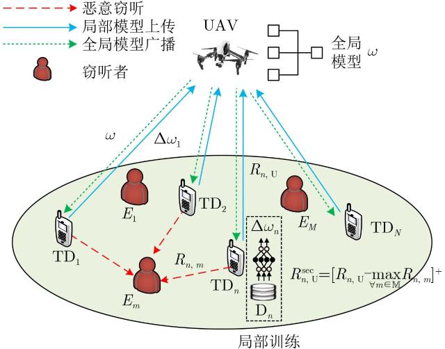 和 1 架式边缘服务器的无人机组成。其中,智能终端 TDn 利用本地数据对参数进行局部训练,从无人机处接收初始全局模型参数,并将其发送回无人机。在飞行过程中,无人机对智能终端上传的局部模型参数进行了迭代收集,从而聚集了全新的联邦学习模型。恶意窃听地面的人 Em 试图通过窃听智能终端向无人机发送的模型参数来恢复其原始数据,这对智能终端的隐私和安全构成了极大的威胁。