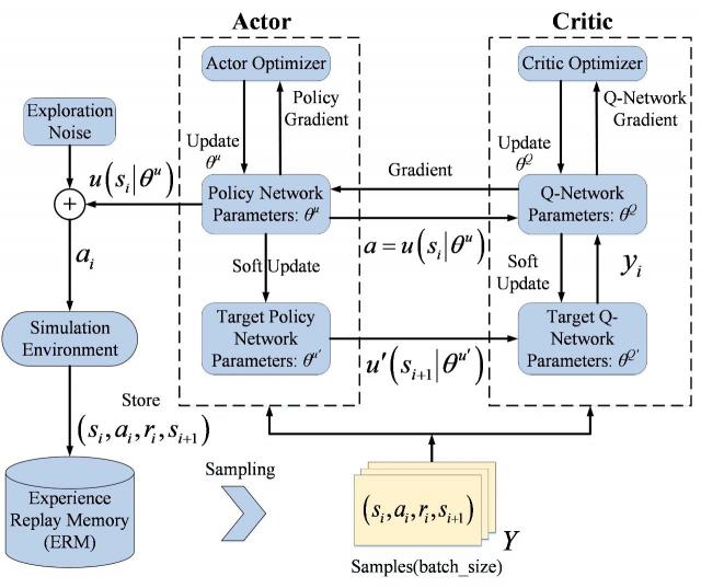 DDPG 选用演员−点评家 ( actor-critic, AC ) 构造,由 actor 网络和 critic 网络构成。第一 t 次全局迭代时,actor 网络处于当前状态st 为了输入,结合噪声输出探索的确定性战略