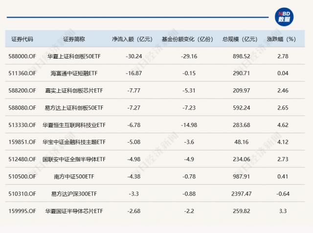 同时,华夏上证科技创新板 50ETF 减少基金认购 29.16 一一一亿份,净流出额为 30.24 亿元;海富通中证短融 ETF 减少基金认购 0.15 一一一亿份,净流出额为 16.87 亿元;嘉实上证科技创新板芯片 ETF 减少基金认购 5.31 一一一亿份,净流出额为 7.77 亿元。