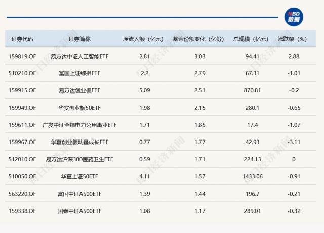 Wind 数据显示,是的 2 月 5 日的非货币 ETF 在市场上,易方达中证人工智能 ETF 增加了基金认购 3.03 十十亿份,净流入额为 2.81 亿元;富国上证综指 ETF 增加了基金认购 2.79 十十亿份,净流入额为 2.2 亿元;易方达创业板 ETF 增加了基金认购 2.51 亿份,净流入额为 5.09 亿元。