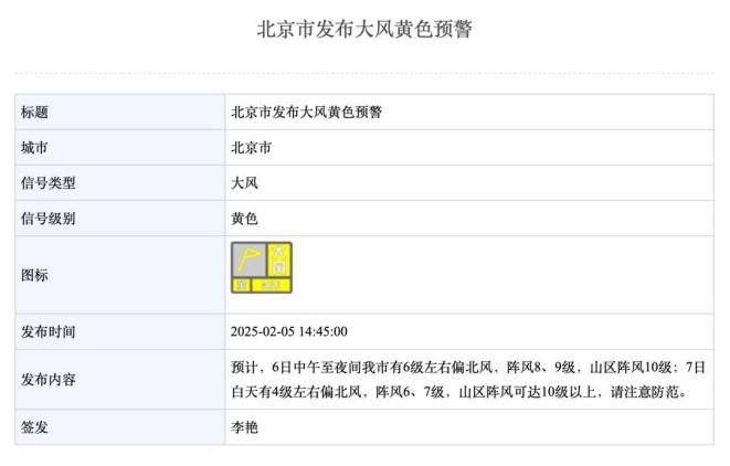 北京气象台发布大风黄色预警:今天中午到晚上,当地有六级北风,八九级阵风,十级山风;明天白天会有四级北风,六七级阵风,十级以上山区阵风。请注意预防。