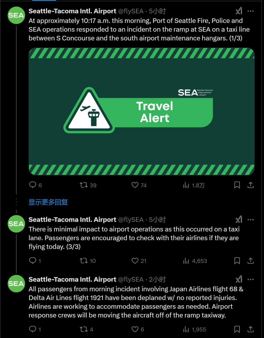 塔科马机场表示,此次事件无人受伤,但两次航班上的乘客都被迫下飞机。