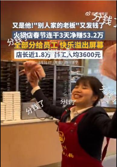 春节期间,四川遂宁的一家火锅店出现在《人民日报》上。原因是店主把除夕到第二天的净利润53.2万元发给员工,有的店长能拿到7000元,普通员工至少能拿到6700元。