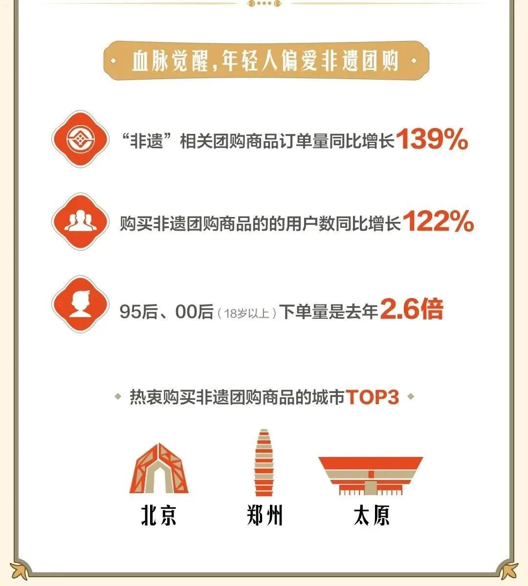 其中,年轻人青睐非遗团购,95 之后,18岁以上的00后人群下单量达到去年。 2.6 倍数。就地域而言,北京、郑州和太原的消费者购买量位居全国前三。