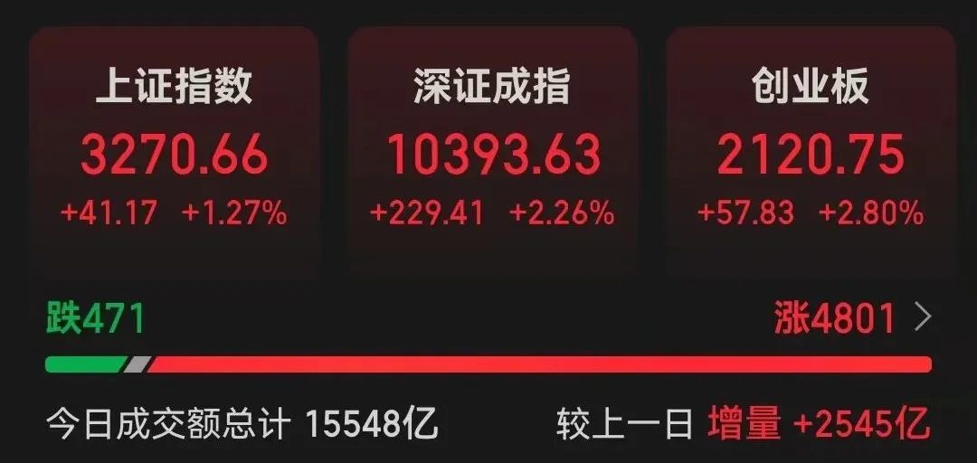 在蛇年的第二个交易日,市场整天大幅反弹。上证指数在收盘时上涨了1.27%;深证指数上涨2.26%;成长型企业市场指数上涨2.80%。另外,北证50指数上涨了5%以上。全天成交额超过1.55万亿元,比上一个交易日增加了2545亿元。