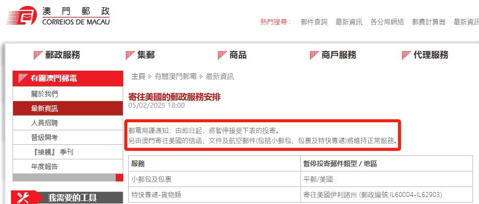 澳门邮电局也宣布,从现在开始,平邮寄到美国的小包裹和包裹;信件、文件和航空邮件是从澳门寄到美国的 (包括小邮包、包裹和特快专递) 然后保持正常。