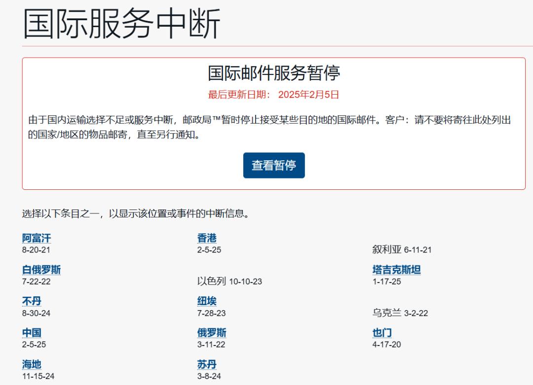 从美国邮政官网可以看出,除了中国内地和香港,俄罗斯、阿富汗等国家和地区也在“国际邮件服务暂停”中。