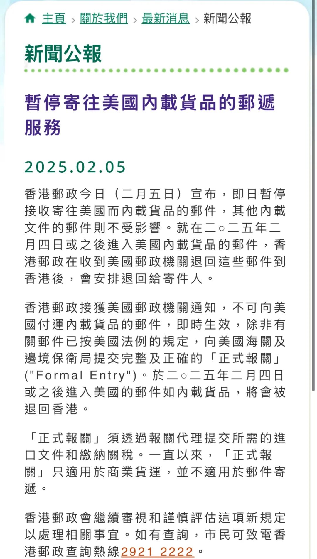 进入美国的货物包裹将于2月4日后退回香港,香港邮政收到后将退还给发件人。