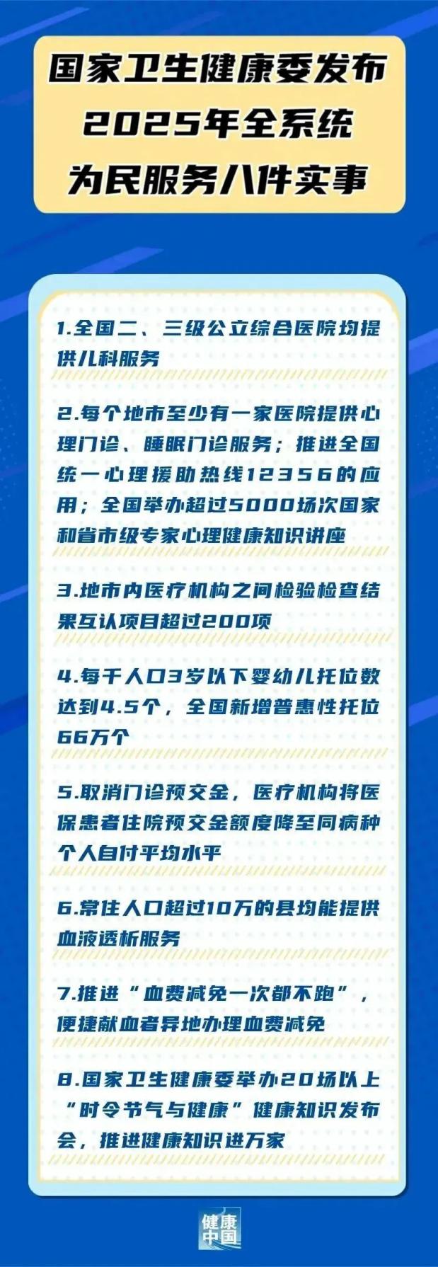 国家卫生健康委研究决定,从2025年3月开始,全国公立医疗机构撤销门诊预付款,将住院预付款降低到同病医疗保险患者个人自费的平均水平,以有效减轻患者预付款的经济压力,增强人民群众的医疗体验。