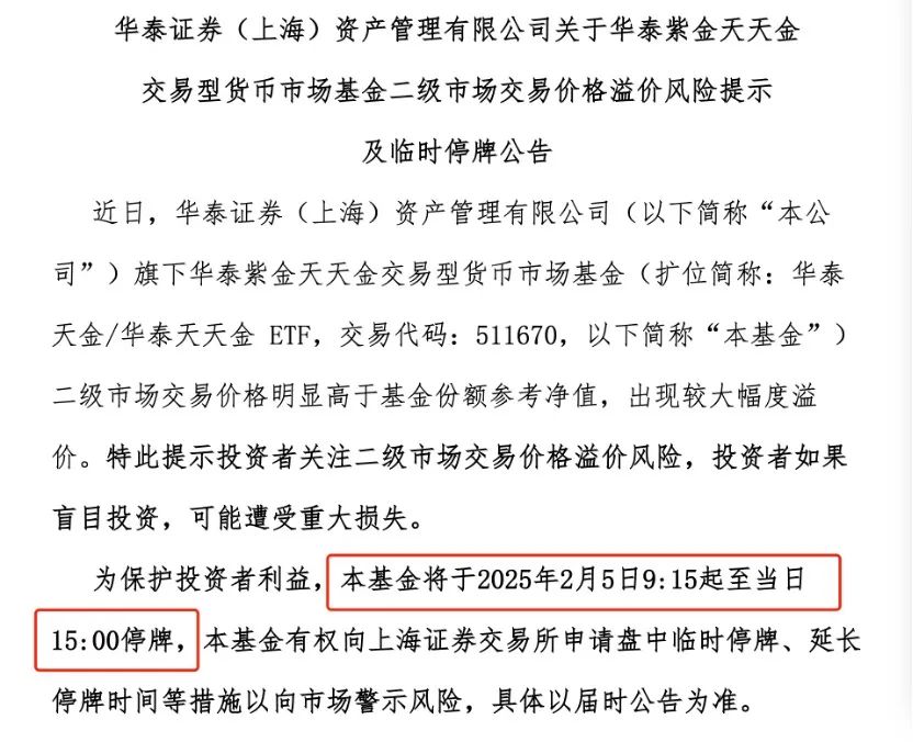 以华泰田甜黄金ETF为例。该基金一大早宣布,该基金将于2月5日9月,因为二级市场交易价格明显高于基金份额参考净值,溢价较大。为了保护投资者的利益,:15起至当天15:00停牌。