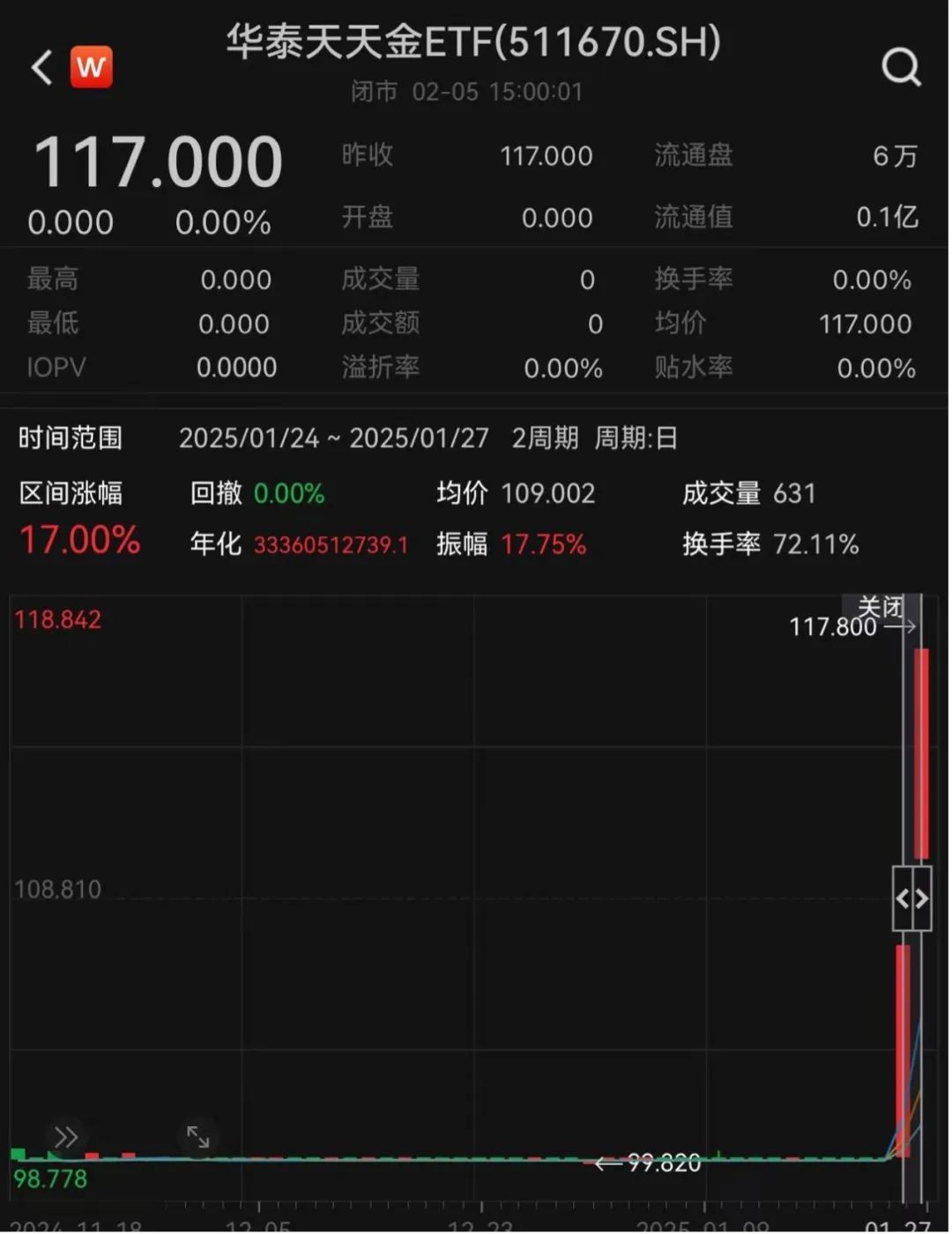盲目追高会有多惨烈?以华泰每天进入ETF为例,该基金在节前两个交易日累计上涨17%,而该产品今年7日年化收益率为1.35%。如果用户在高位盲目购买,未来净值会下降,他们将面临损失。