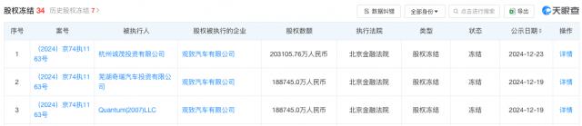 本月,观致汽车新增了第三条股权冻结信息。12 月 19 日本,观致汽车新增两条股权冻结信息,被执行人分别为芜湖奇瑞汽车投资有限公司,QuantumLLC,冻结股份的金额都是大约的 18.87 一亿元,合计约 37.74 一亿元,冻结期为三年,即三年, 2024 年 12 月 19 日至 2027 年 12 月 18 日,所有执行法院都是北京金融法院。