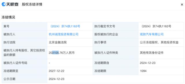 12 月 23 日,观致汽车有限公司(以下简称“观致汽车”)增加了股权冻结信息。被执行人为杭州诚茂投资有限公司,被执行股份的公司为观致汽车有限公司,冻结股份金额约为 20.3 冻结期限自1亿元人民币以来。 2024 年 12 月 23 日至 2027 年 12 月 22 日。