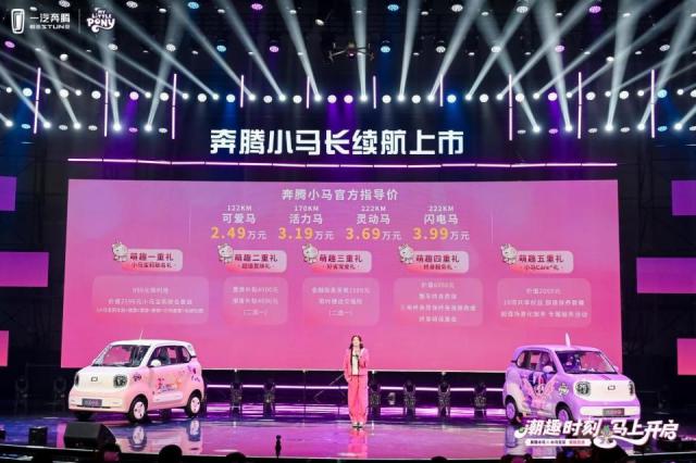 10 月 28 日本,一汽奔流与世界著名名人物携手。 IP 小马宝莉,正式推出奔腾小马。 222km 长续航版车型-智能马和闪电马,售价区间为 3.69 万元至 3.99 一万元,为微电市场增添了另一把火。这次上市不仅显示了奔腾小马续航里程的显著提升,也给智能配置和个性化定制带来了很多惊喜。