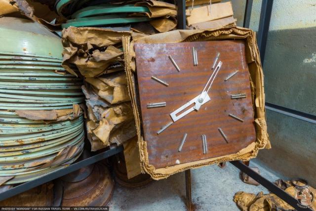 除了过滤器和民防用品,我还在一个房间里找到了一个挂钟。它散落在一堆纸和纸箱里。钟表生锈了,但表盘仍然可以识别。时针和分针停在某个时刻,总是凝结在过去的某个时刻。