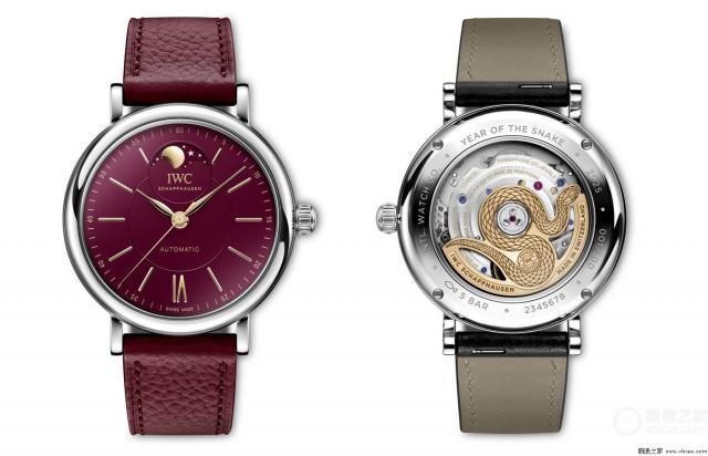 手表评价:首先是万国推出的蛇年表——柏涛菲诺月相自动手表。 37 蛇年特别版。手表特别选用勃艮第红色表盘,与月相盈亏显示的金色月亮和谐辉映。镀金蛇形摆陀工艺精湛,惟妙惟肖。选择直径的制表师 37 mm刚性表壳,圆润流畅的弧线优雅和谐,与勃艮第红色表盘相结合,更加精致华丽。手表的月相显示位于 12 点击位置,运行精确,122 一年后,与月球的具体轨道只有一天的误差。在勃艮第红色背景的映衬下,金色的月亮和星星熠熠生辉,与镀金指针和镶嵌时标相结合,美不胜收。翻看表底,镀金摆陀采用蛇形设计,向中国蛇年致敬。手表内部配有品牌自制手表。 32800 自动机械机芯,可提供五天动力储备。这款手表搭配黑色和勃艮第红色小牛皮表带,限量销售。 500 枚。