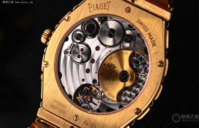 不同于原来的石英机芯,POLO 79 搭载伯爵 1200P1 型号自动机械机芯。这个机芯也是以纤薄为特点的,薄而厚。 2.35 mm,细节可以通过背透后盖观察到。采用珍珠陀结构,夹板经日内瓦波纹和圆纹打磨,加上蓝钢螺丝和填金刻字,丰富了细节质感。参数方面,1200P1 型机芯振频 拥有21600VPH, 44 小时动储。