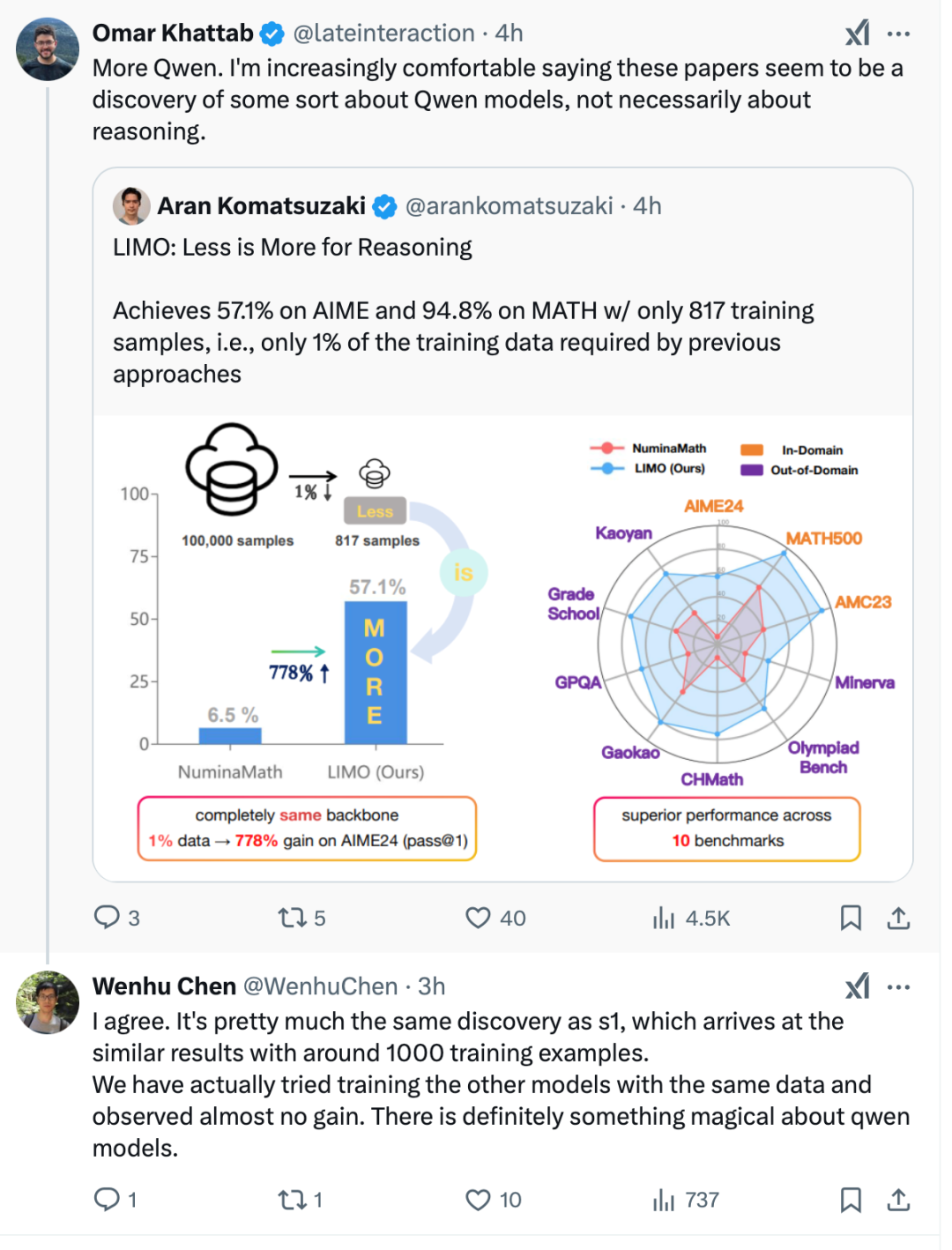 “以通义千问模型为基础,可以用很少的样本数据形成新的推理模型,但如果换成其他基础模型,新模型的能力就不会提高。因此,Qwen模型真的很神奇,而不是s1。。” 谢伟迪说。