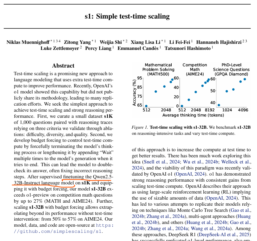 斯坦福s1论文原文还表示,该模型基于阿里通义千问模型进行微调