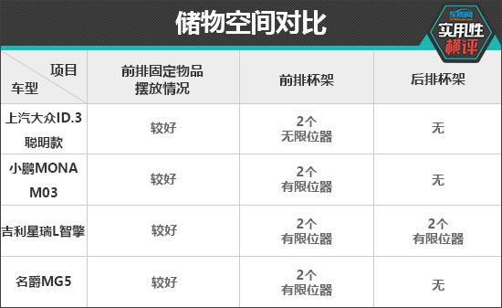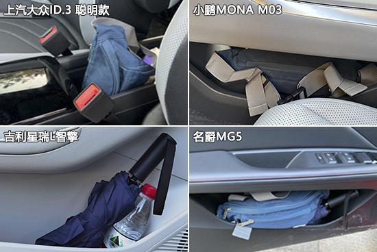 车内储物空间方面,星瑞 L 整车收纳空间(杯架除外)最多,达到 17 个。名爵 MG5 紧随其后,收纳空间为 12 个。而小鹏 MONA M03 整个汽车的储物空间只有 9 个,数量相对较少。在实际测量过程中,只有爵士 MG5 配眼镜盒,所有物品均可合理放置在车内。相比之下,ID.3 墨镜和口红没有合适的储物空间,整体表现略逊一筹。
