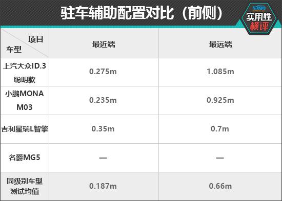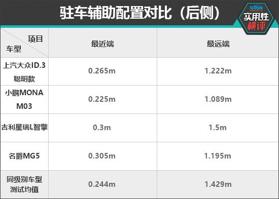 在驻车辅助配置方面,在前驻车雷达检测中,除名爵外 MG5 除了前雷达之外,其它三款车型的最远检测距离都超过了同级别车型的平均检测距离,雷达的功率性能也不错。最近提醒距离方面,ID.3 接近同级别车型的平均检测值,性能优于其它三款车型。