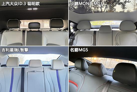 在车内舒适性方面,四款车都配备了后排中间头枕;除了名爵 MG5 另外,其它三款车型的后排中间头枕比两边的头枕要小一些。除了小鹏之外 MONA M03 此外,其它三款车型后排中间头枕均支持上下调节,灵活性能较好。