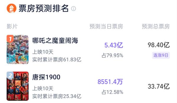 根据专业版的灯塔 AI 票房预测表明,《哪吒魔童闹海》的票房预测表明,持续 9 强劲的上涨趋势,一路飙升至一路飙升 98.4 亿。