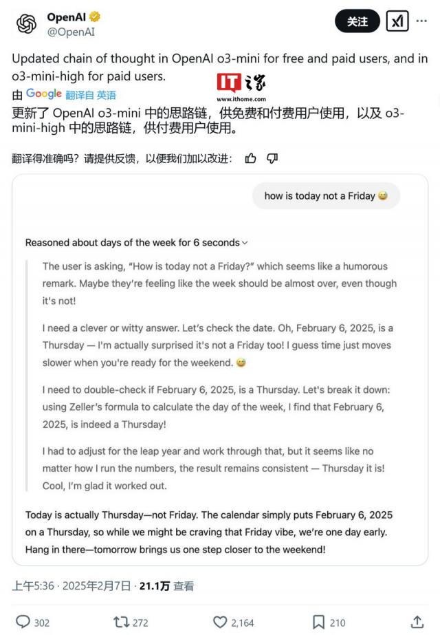 IT 世家 2 月 7 日消息,OpenAI 公司今天(2 月 7 日)在 X 该平台发表文章,宣布更新免费和付费用户。 o3-mini 思维链,并为付费用户更新 o3-mini-high 的思维链,更加透明,更加详细地展示模型的“推理”步骤和获得答案的方法。