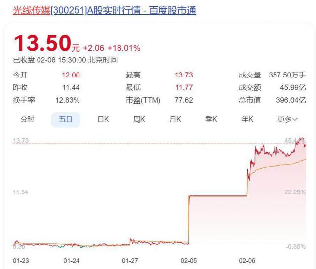 而且光传媒的股价也开始了暴涨行情,继续 2 月 5 日 20cm 涨停后,2 月 6 日再涨 18%,2 天上涨幅度超过 市值飙升40% 116 总市值直追亿元 400 亿元。