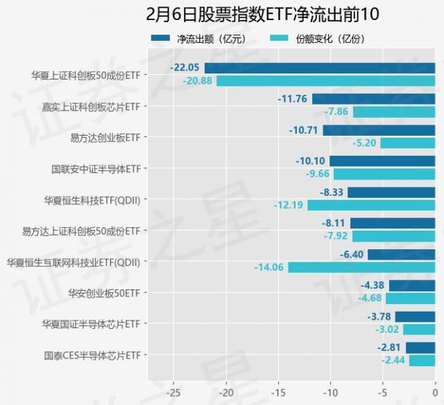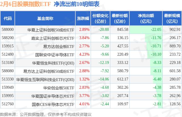当天有 354 只股票指数 ETF 资金净流出出现在基金中,其中华夏上证科技创新板排名第一。 50 成分 ETF(588000),份额下降 20.88 一亿份,净流出额为 22.05 亿元。