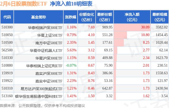 当天有 259 只股票指数 ETF 资金净流入为基金,其中华泰柏瑞沪深圳净流入排名第一。 增加了300ETF(510300)的份额 7.69 十亿份,净流入额为 30.09 亿元。