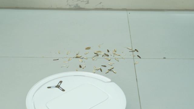 首先,颗粒物是干净的。我们用散落的瓜子壳来粉碎少量的瓜子皮。可以说不仅有大的块状颗粒,还有小的小颗粒,容易被机器人推开或者被气流吹走。实际测量地宝 T80 可以借助灵动边刷和最大 18000Pa 吸力,在一次清洗中收集绝大多数瓜子壳,少量残留物也在后续的二次清洗路径中得到充分处理。