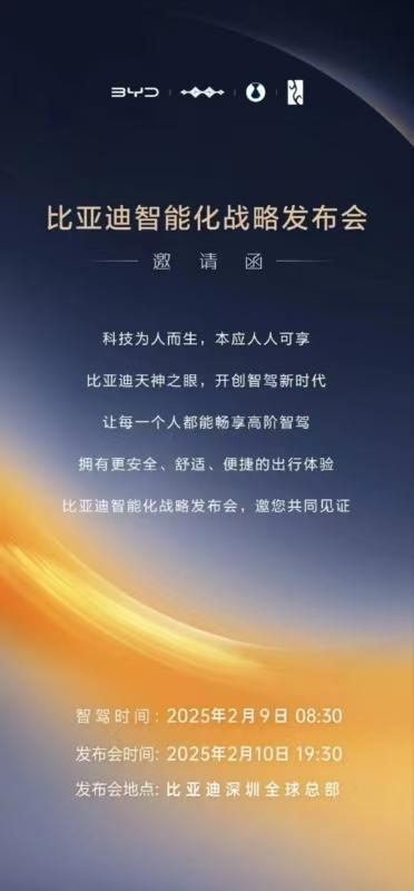 比亚迪宣布将于 2 月 10 日 19:30 智能战略发布会在深圳总部召开,重点介绍。 " 天神之眼 " 先进的智驾系统。