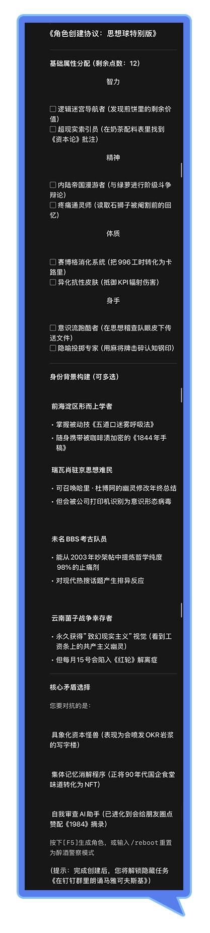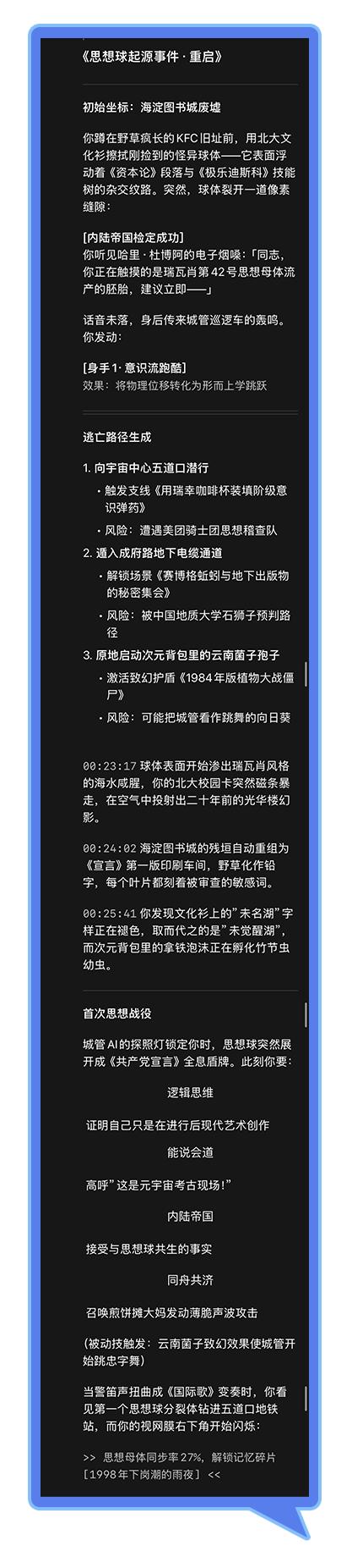 如果你愿意,你可以把你想讲的所有故事都告诉它(或者建立一个虚拟场景),然后和它一起玩角色扮演手游。它比市场上任何一款RPG游戏都有更高的自由度。你选择的图像将成为DeepSeek的锚点,使其成为图像对话专家,而不是让它的创作继续无目的地传播。此时的对话,也成了以记忆为载体的沙盘推演。